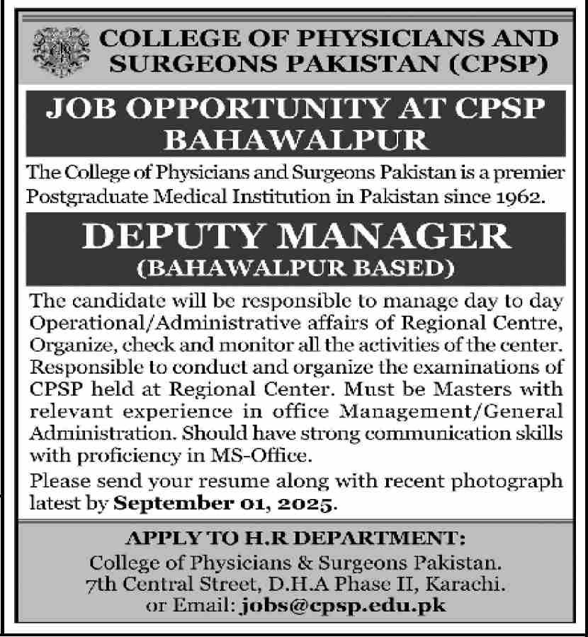 College Of Physicians And Surgeons Bahawalpur Jobs 2025 announce the Contract career opportunities for the post of See Below Ad in Punjab, Bahawalpur for the fresh and experienced candidates on Contract basis who have Check Advertisement degree. Posted date of this post is 17/08/2025 and the last date is 01/09/2025. if you are eligible for this job apply before due date.