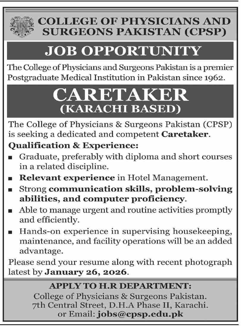 The College of Physicians & Surgeons Pakistan (CPSP) is seeking a dedicated and competent Caretaker.