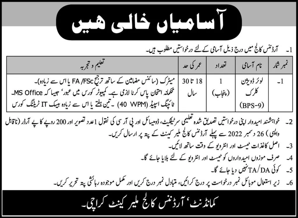 Command Ordinance College Malir Cantt Karachi Jobs 2022 announce the Contract career opportunities for the post of See Below Ad in Sindh, Karachi for the fresh and experienced candidates on Contract basis who have Check Advertisement degree. Posted date of this post is 10/12/2022 and the last date is 26/12/2022. if you are eligible for this job apply before due date.