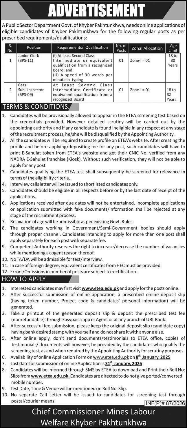Commissionerate Of Mines Labour Welfare Peshawar Jobs 2026 announce the Contract career opportunities for the post of See Below Ad in Khyber Pakhtunkhwa, Peshawar for the fresh and experienced candidates on Contract basis who have Check Advertisement degree. Posted date of this post is 07/01/2026 and the last date is 31/01/2026. if you are eligible for this job apply before due date.
