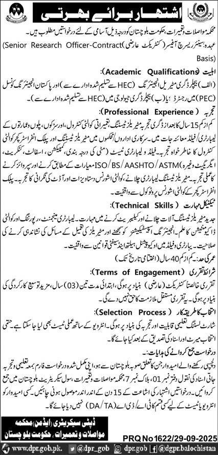 Communication & Works Department Balochistan Jobs 2025 announce the Contract career opportunities for the post of See Below Ad in Balochistan, Quetta for the fresh and experienced candidates on Contract basis who have Check Advertisement degree. Posted date of this post is 30/09/2025 and the last date is 14/10/2025. if you are eligible for this job apply before due date.