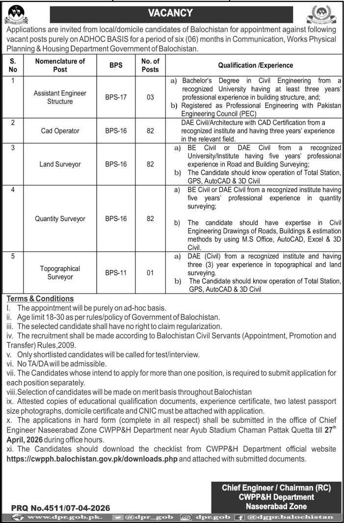 Communications Works Physical Planning CWPP&H Jobs 2026 announce the Contract career opportunities for the post of See Below Ad in Balochistan, Quetta for the fresh and experienced candidates on Contract basis who have Check Advertisement degree. Posted date of this post is 08/04/2026 and the last date is 27/04/2026. if you are eligible for this job apply before due date.