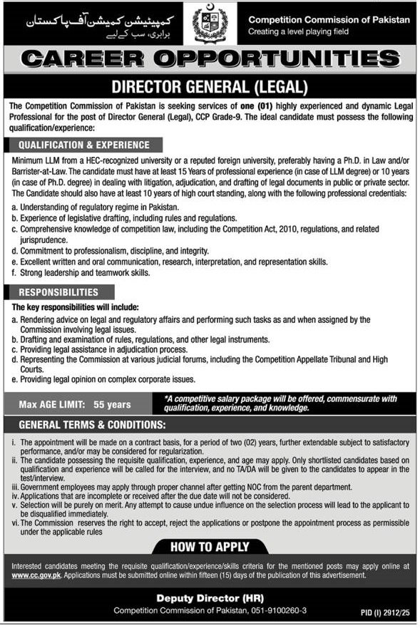 The Competition Commission of Pakistan is seeking services of one (01) highly experienced and dynamic Legal Professional for the post of Director General (Legal), CCP Grade-9. The ideal candidate must possess the following qualification/experience: