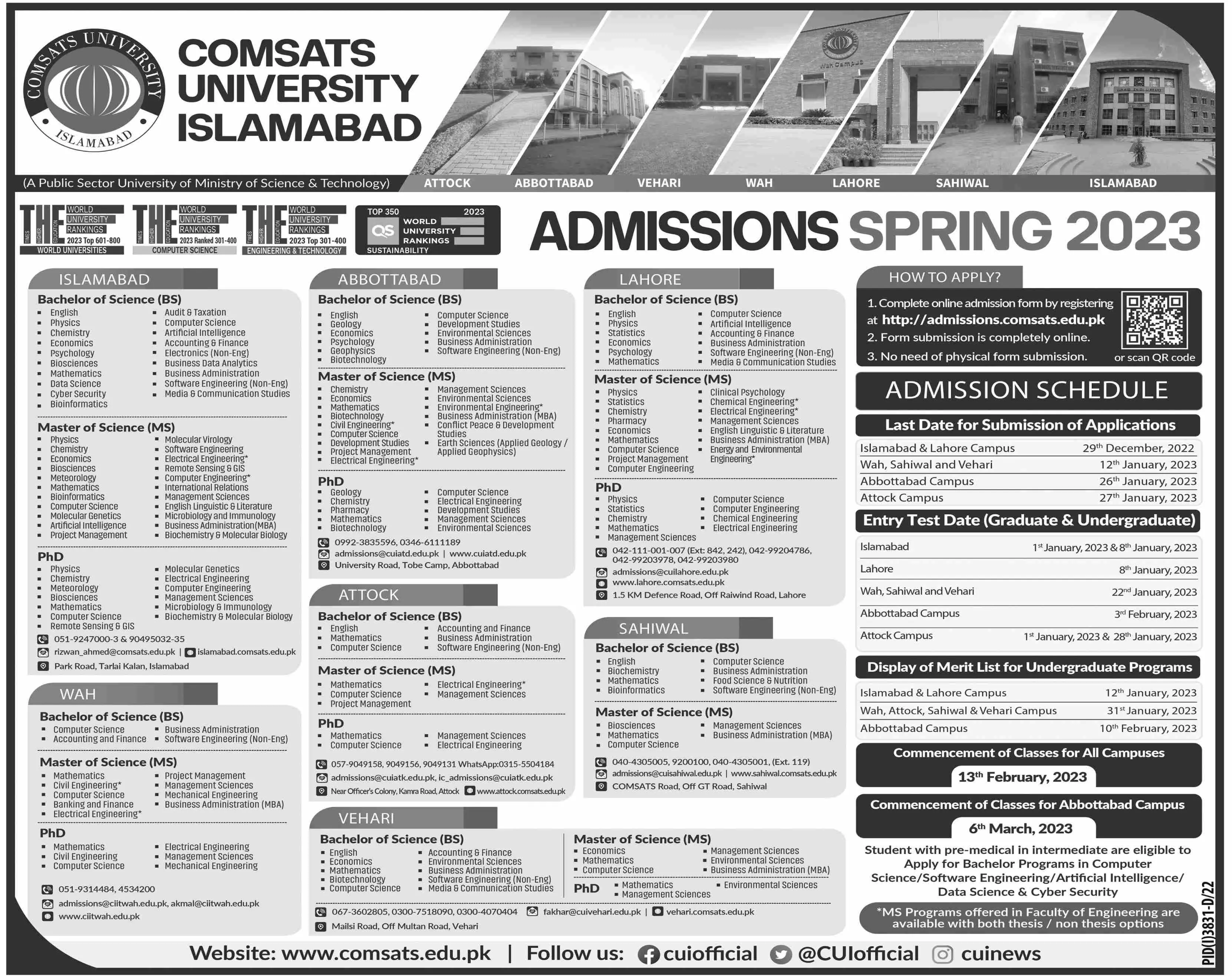 COMSATS university Islamabad Admissions 2023 announce the Contract career opportunities for the post of See Below Ad in Federal, Islamabad for the fresh and experienced candidates on Contract basis who have Graduation degree. Posted date of this post is 18/12/2022 and the last date is 29/12/2022. if you are eligible for this job apply before due date.