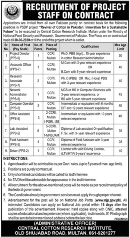 Applications are invited from all over Pakistan purely on contract basis for the following positions in PSDP project "Revival of Cotton in Pakistan: Innovation for a Sustainable Future" to be executed by Central Cotton Research Institute, Multan under the Ministry of National Food Security and Research, Government of Pakistan. The Posts are on contractual basis till 30-06-2030 or till the end of the project which is earlier.
