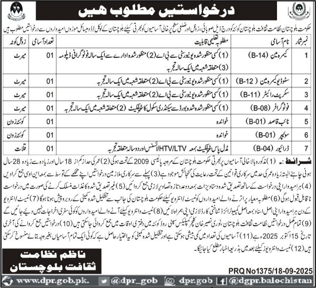 (1) Recruitment for the above vacant posts will be under the prevailing Government of Balochistan policy 2009. (2) Age limit should be a minimum of 18 years and a maximum of 28 years, however, relaxation in the upper age limit is permissible under government rules. (3) Government employees should submit their applications through their respective departments with NOC. (4) Each candidate must submit their application along with attested documents and two recent photographs. (5) Applications with unattested documents will not be accepted. (6) Candidates meeting the required criteria will appear before the committee constituted by the Government of Balochistan for test/interview. (7) On the day of the test/interview, each candidate must bring their original certificates along with their original computerized National Identity Card. (8) No travel allowance (TA) or daily allowance (DA) will be paid to candidates appearing for the test/interview. (9) All complete applications can be submitted during office hours at the Directorate of Culture Balochistan, Nuri Naseer Khan Khachar Complex, Spini Road, Quetta. (10) The last date for submission of applications is October 15, 2025. (11) The number of posts may be increased or decreased, and the constituted committee reserves the right to cancel any or all posts without assigning any reason. (12) Candidates for test/interview will be informed later through newspapers.
