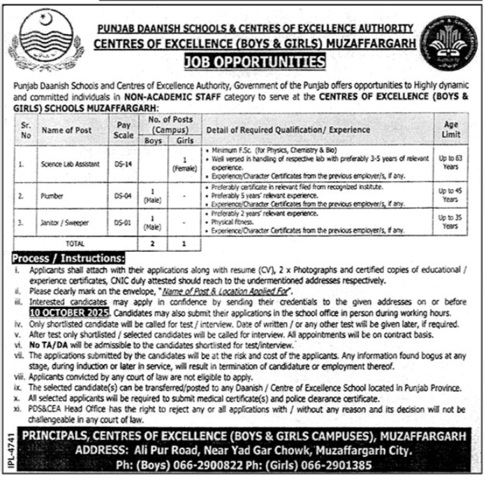 Daanish Schools Boys & Girls Muzaffargarh Jobs 2025 announce the Contract career opportunities for the post of See Below Ad in Punjab, Muzaffargarh for the fresh and experienced candidates on Contract basis who have Check Advertisement degree. Posted date of this post is 24/09/2025 and the last date is 10/10/2025. if you are eligible for this job apply before due date.
