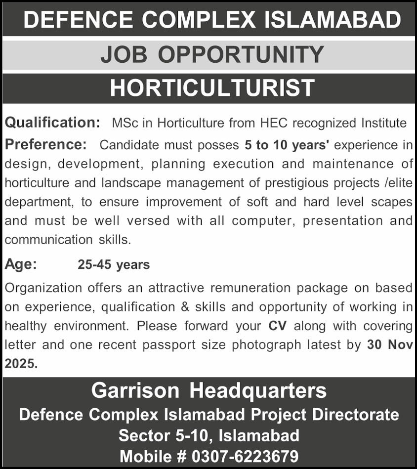 Defence Complex Islamabad Project Directorate Jobs 2025 announce the Contract career opportunities for the post of See Below Ad in Federal, Islamabad for the fresh and experienced candidates on Contract basis who have Check Advertisement degree. Posted date of this post is 29/11/2025 and the last date is 30/12/2025. if you are eligible for this job apply before due date.