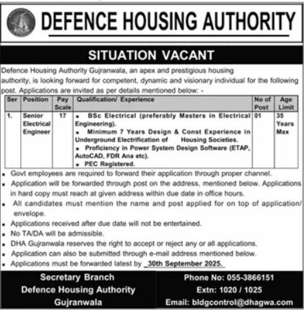 Defence Housing Authority DHA Gujranwala Job 2025 announce the Contract career opportunities for the post of See Below Ad in Punjab, Gujranwala for the fresh and experienced candidates on Contract basis who have Check Advertisement degree. Posted date of this post is 17/09/2025 and the last date is 30/09/2025. if you are eligible for this job apply before due date.