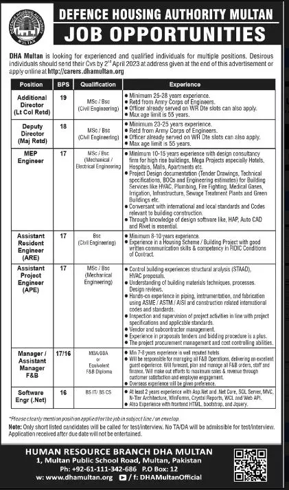 Defence Housing Authority Multan Jobs 2023 announce the Contract career opportunities for the post of See Below Ad in Punjab, Multan for the fresh and experienced candidates on Contract basis who have Check Advertisement degree. Posted date of this post is 26/03/2023 and the last date is 02/04/2023. if you are eligible for this job apply before due date.