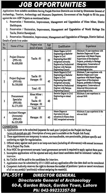 Applications from suitable candidates having Punjab Province Domicile are invited by Directorate General of Archaeology, Tourism, Archaeology and Museums Department, Government of the Punjab to fill the posts against the new ADP Projects as mentioned below: