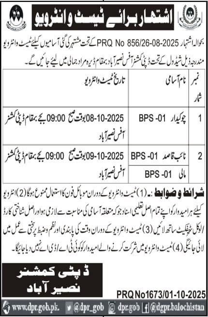 Reference to Advertisement PRQ No. 856/26-08-2025: Tests and interviews for the advertised positions will be held at the Deputy Commissioner's Office, Naseerabad at Dera Murad Jamali according to the following schedule.