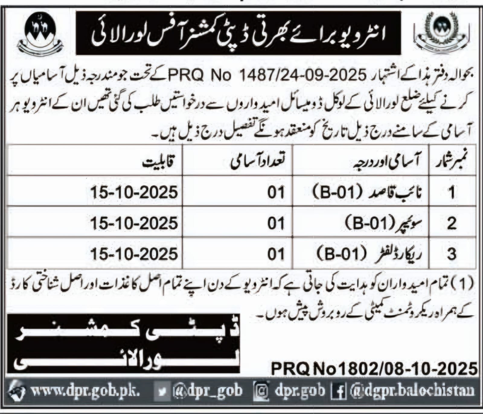 With reference to this office's advertisement No. PRQ No 1487/24-09-2025, applications were invited from local domicile candidates of Loralai district to fill the following vacancies. The interviews for these positions will be held on the dates mentioned below. The details are as follows.