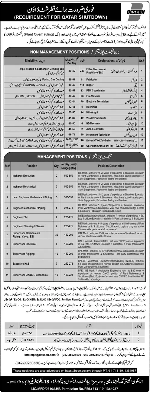 - Descon Engineering Limited Pakistan is looking to staff for Qatar as In-charge Execution, In-charge Mechanical, Engineer, Supervisor, Executive HSE, Fitter, Fabricator, Rigger, PTW Coordinator, Fire Watcher, Electrical Technician, Machinist, Mill-Wright, Welder, HD Mechanic, Electrician, Technician, and Driver.