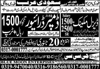 Diesel Mechanic & Dumper Driver Jobs 2026 In Saudi Arabia announce the Contract career opportunities for the post of See Below Ad in Saudi Arabia for the fresh and experienced candidates on Contract basis who have Check Advertisement degree. Posted date of this post is 16/01/2026 and the last date is 20/01/2026. if you are eligible for this job apply before due date.