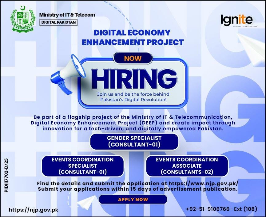 Digital Economy Enhancement Project DEEP Jobs 2026 announce the Contract career opportunities for the post of See Below Ad in Federal, Islamabad for the fresh and experienced candidates on Contract basis who have Check Advertisement degree. Posted date of this post is 19/03/2026 and the last date is 03/04/2026. if you are eligible for this job apply before due date.