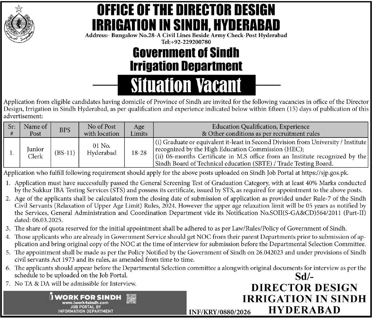 Director Design Irrigation In Sindh Hyderabad Jobs 2026 announce the Contract career opportunities for the post of See Below Ad in Sindh, Hyderabad for the fresh and experienced candidates on Contract basis who have Check Advertisement degree. Posted date of this post is 05/03/2026 and the last date is 19/03/2026. if you are eligible for this job apply before due date.