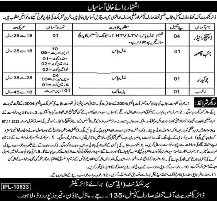 - Directorate of Consumer Protection Council is looking for candidates for following posts as per job advertisement published in daily Express Newspaper of October 22, 2022 for location Lahore, lahore Punjab Pakistan: sanitary worker driver ltv driver sweeper chowkidar naib qasid htv driver and dispatch rider Educational qualifications required Middle and Primary etc.