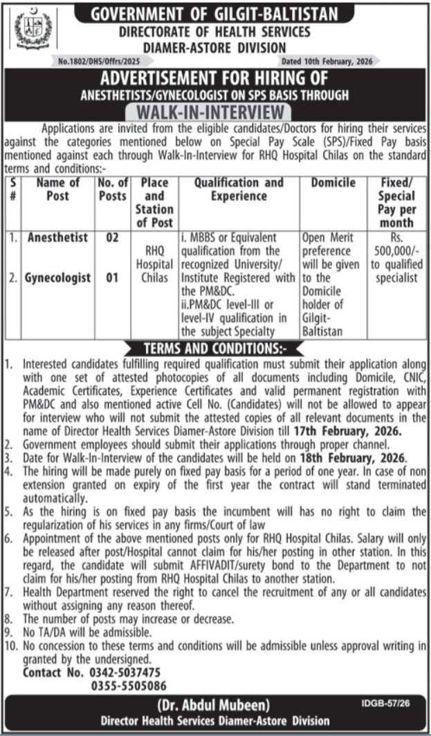 Directorate Of Health Services Astore Jobs Notice 2026 announce the Contract career opportunities for the post of See Below Ad in Gilgit Baltistan, Gilgit for the fresh and experienced candidates on Contract basis who have Check Advertisement degree. Posted date of this post is 12/02/2026 and the last date is 17/02/2026. if you are eligible for this job apply before due date.