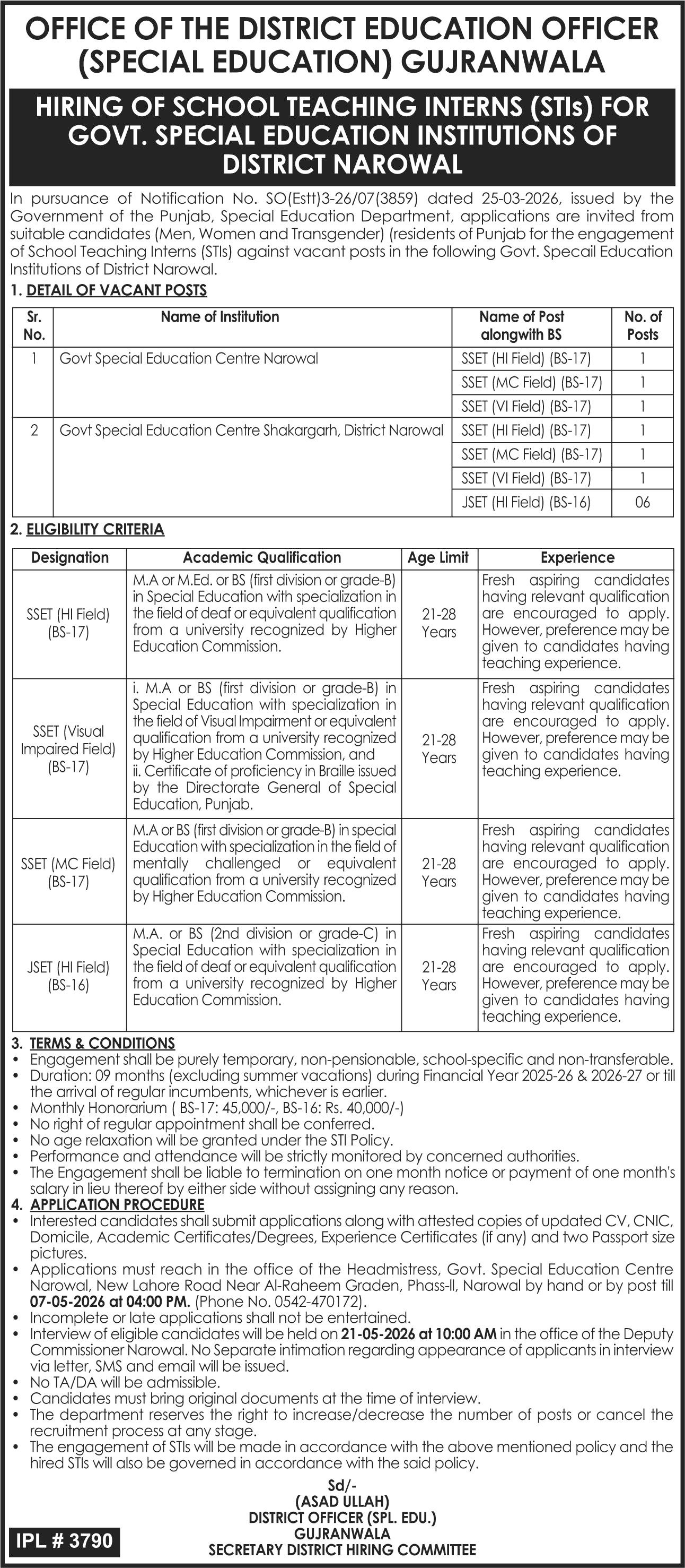 District Education Officer Gujranwala Jobs 2026 announce the Contract career opportunities for the post of See Below Ad in Punjab, Gujranwala for the fresh and experienced candidates on Contract basis who have Check Advertisement degree. Posted date of this post is 19/04/2026 and the last date is 07/05/2026. if you are eligible for this job apply before due date.