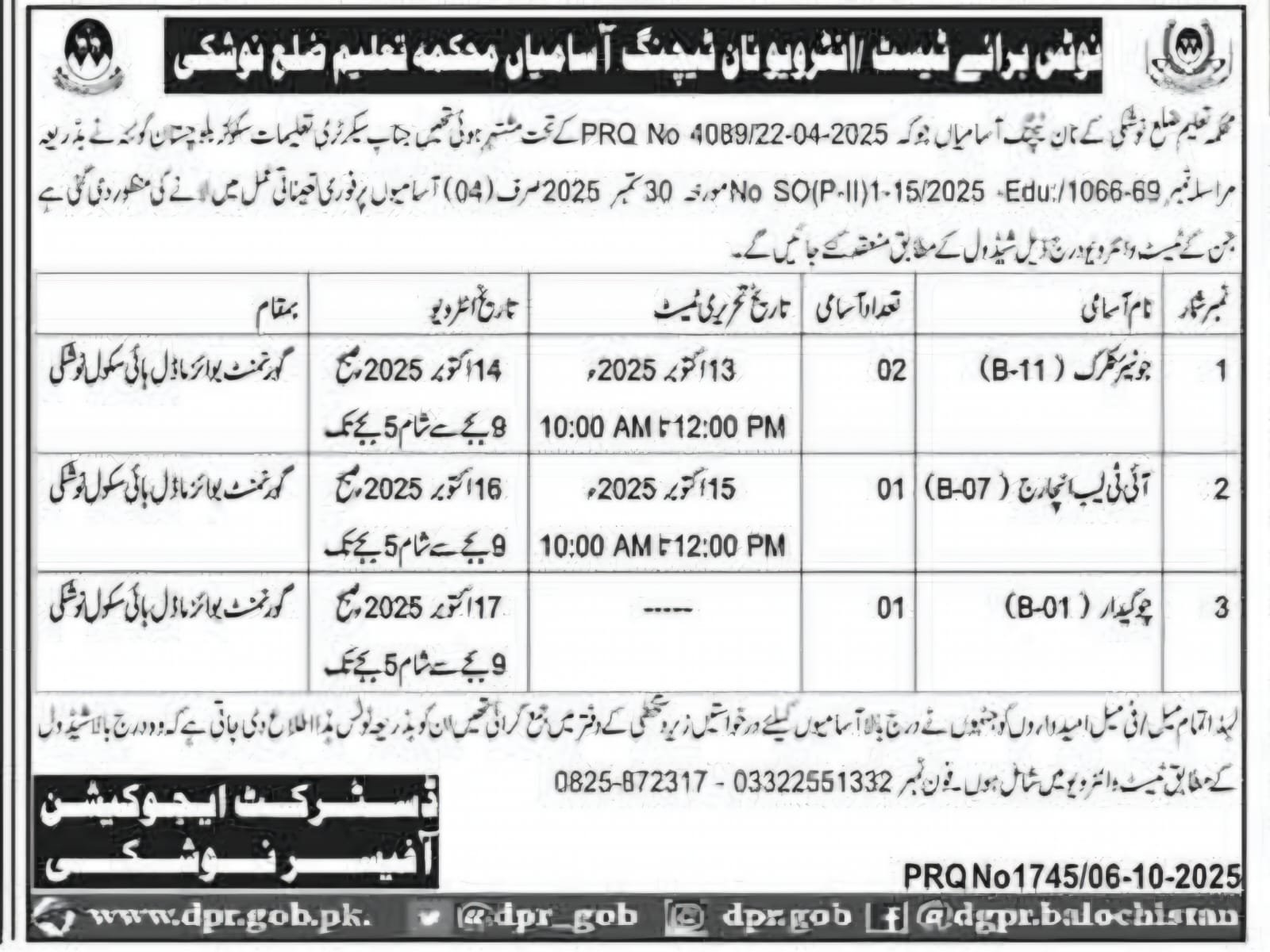 The non-teaching posts of the Education Department, District Nushki, which were advertised under PRO NO 4089/22-04-2025, have been approved for immediate appointment on only (04) posts by the Secretary of Education, Balochistan Quetta, through letter number 1066-69/SO(P-II)1-15/2025 dated September 30, 2025. The test and interview will be held according to the schedule below.