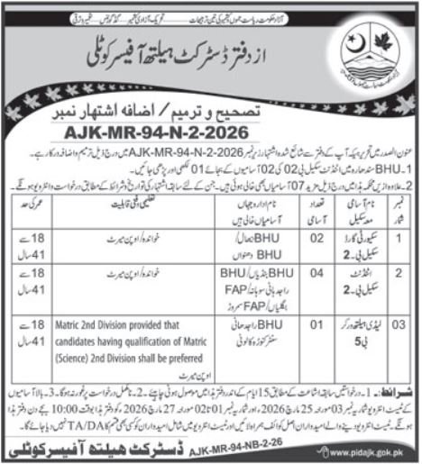 District Health Authority Kotli Azad Jammu Kashmir Jobs 2026 announce the Contract career opportunities for the post of See Below Ad in Azad Jammu Kashmir, Muzaffarabad for the fresh and experienced candidates on Contract basis who have Check Advertisement degree. Posted date of this post is 21/02/2026 and the last date is 08/03/2026. if you are eligible for this job apply before due date.