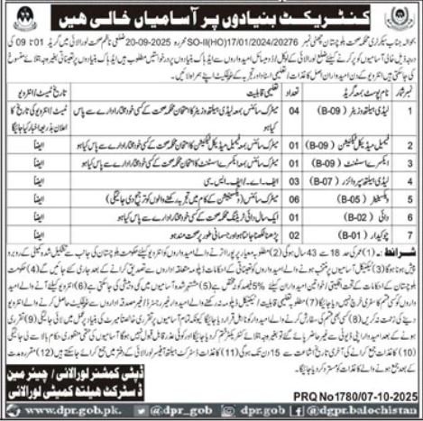 Reference: Mr. Secretary, Health Department Balochistan, Letter No. 017/01/2024/20276, dated 20-09-2025. Due to the urgent need for Grade 09 vacancies in the global health and air sector, two female candidates are required on a contract basis from the local or domicile candidates of Loralai district to fill the vacant positions. Ad hoc appointments can be made on a temporary basis. On the day of the interview, candidates must bring their original documents, educational certificates, and experience certificates.
