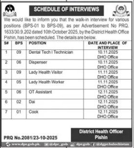 District Health Office Pishin Jobs interview 2025 announce the Contract career opportunities for the post of See Below Ad in Balochistan, Pishin for the fresh and experienced candidates on Contract basis who have Check Advertisement degree. Posted date of this post is 24/10/2025 and the last date is 12/11/2025. if you are eligible for this job apply before due date.