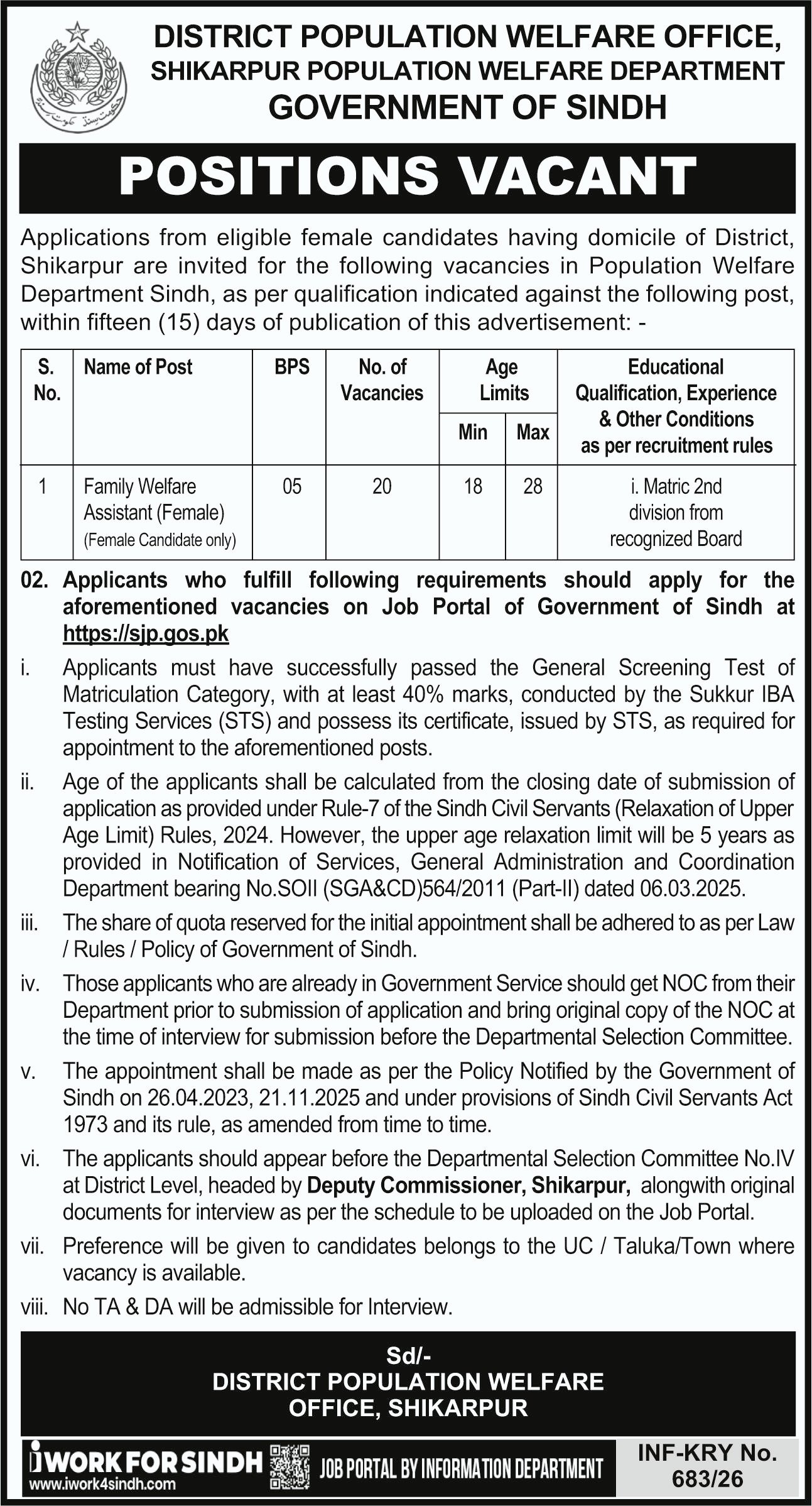 District Population Welfare Office PWD Shikarpur Jobs 2026 announce the Contract career opportunities for the post of See Below Ad in Sindh, Sheikhupura for the fresh and experienced candidates on Contract basis who have Check Advertisement degree. Posted date of this post is 24/02/2026 and the last date is 10/03/2026. if you are eligible for this job apply before due date.