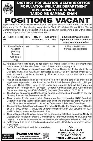 District Population Welfare Office Tando Muhammand Khan Job announce the Contract career opportunities for the post of See Below Ad in Sindh, Tando Muhammad Khan for the fresh and experienced candidates on Contract basis who have Check Advertisement degree. Posted date of this post is 24/02/2026 and the last date is 06/03/2026. if you are eligible for this job apply before due date.