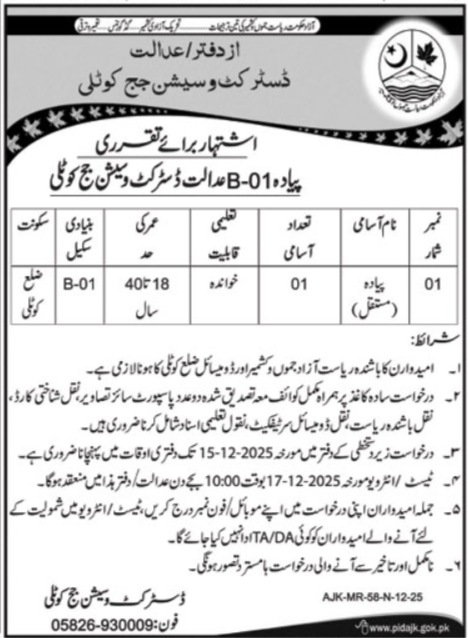 District & Session Judge Kotli Azad Jammu Kashmir Jobs 2025 announce the Contract career opportunities for the post of See Below Ad in Azad Jammu Kashmir, Kotli for the fresh and experienced candidates on Contract basis who have Check Advertisement degree. Posted date of this post is 06/12/2025 and the last date is 15/12/2025. if you are eligible for this job apply before due date.