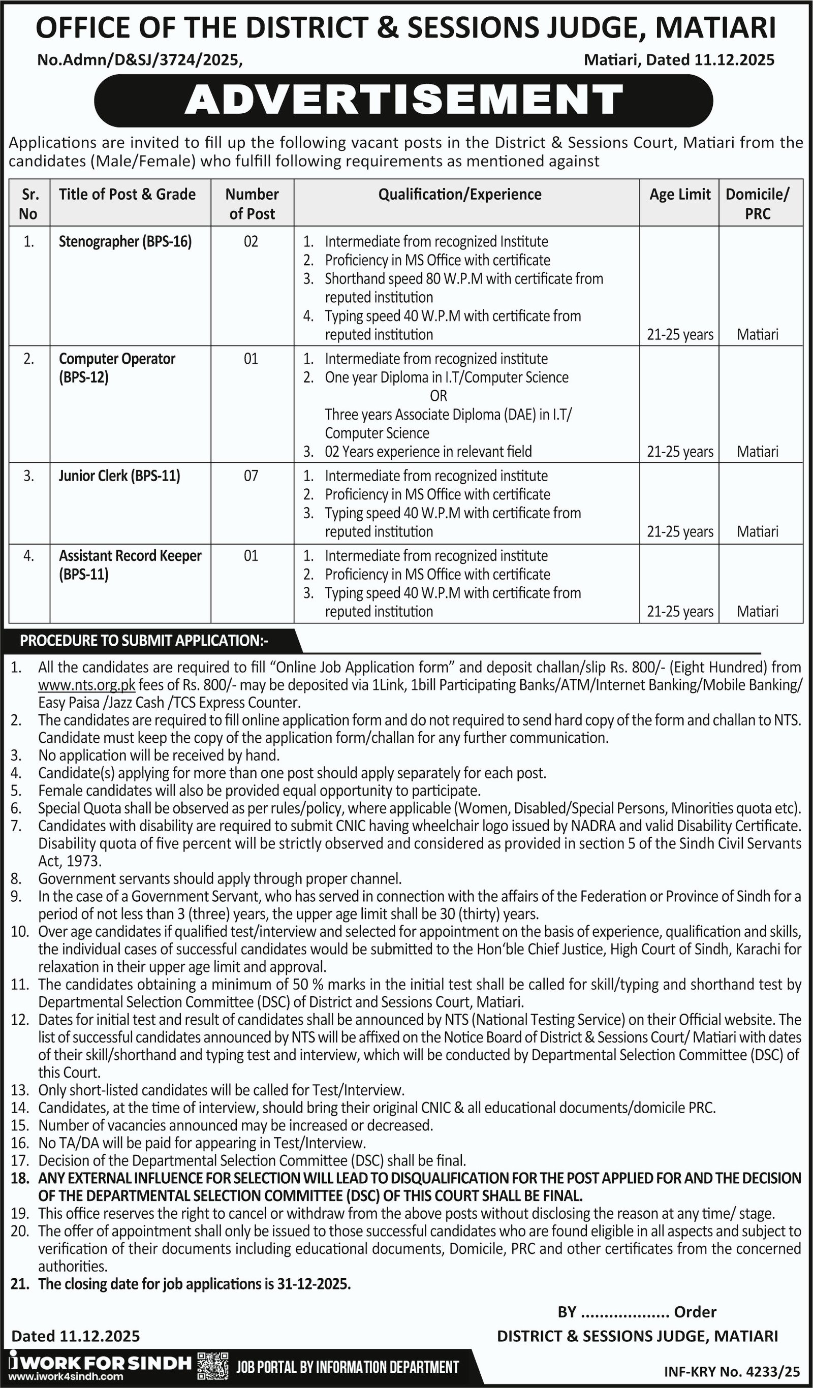 District & Session Judge Matiari Jobs 2025 announce the Contract career opportunities for the post of See Below Ad in Sindh, Matiari for the fresh and experienced candidates on Contract basis who have Check Advertisement degree. Posted date of this post is 13/12/2025 and the last date is 31/12/2025. if you are eligible for this job apply before due date.