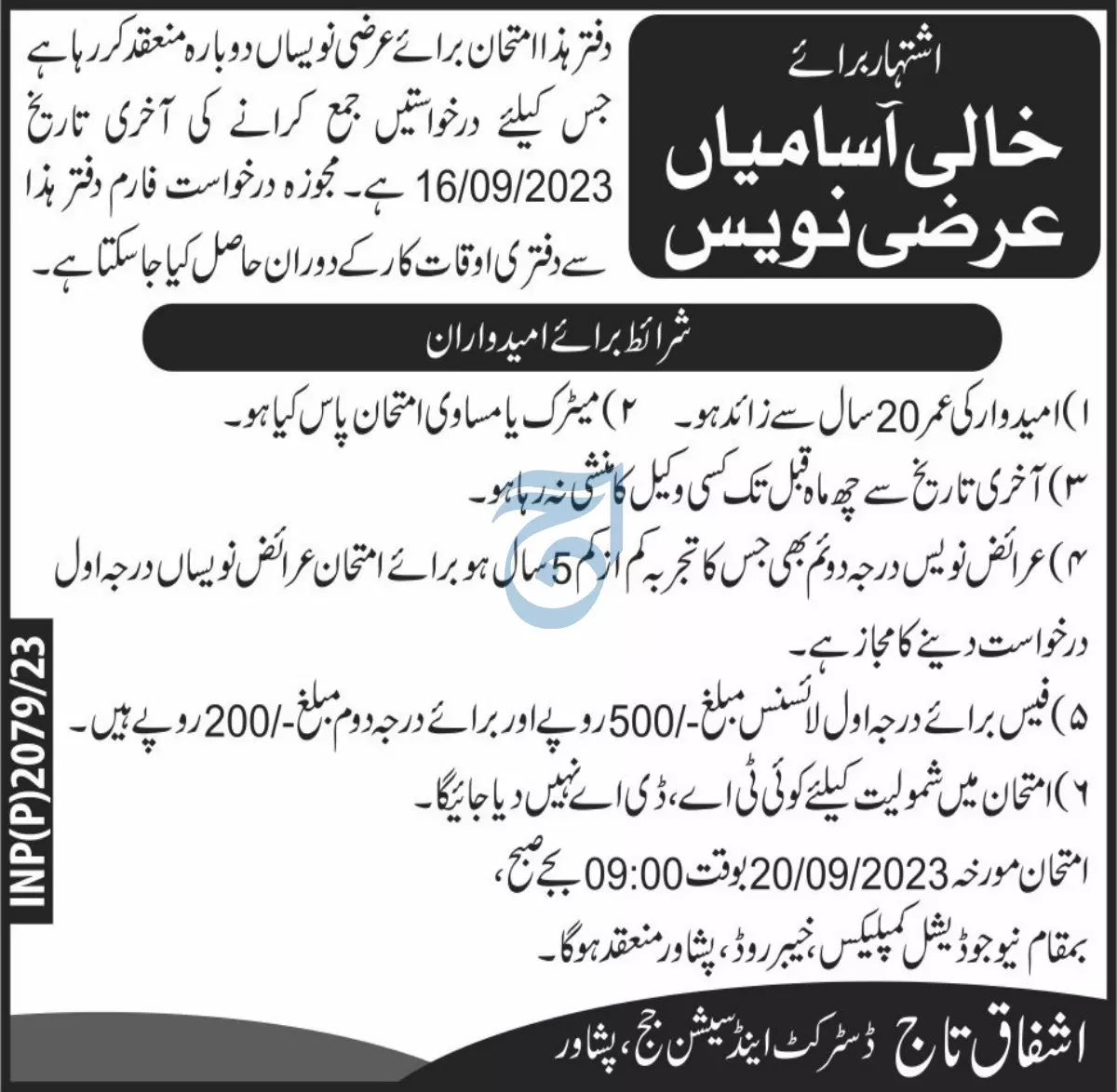 Examination will be held on 20/09/2023 at 09:00 AM at New Judicial Complex, Khyber Road, Peshawar.