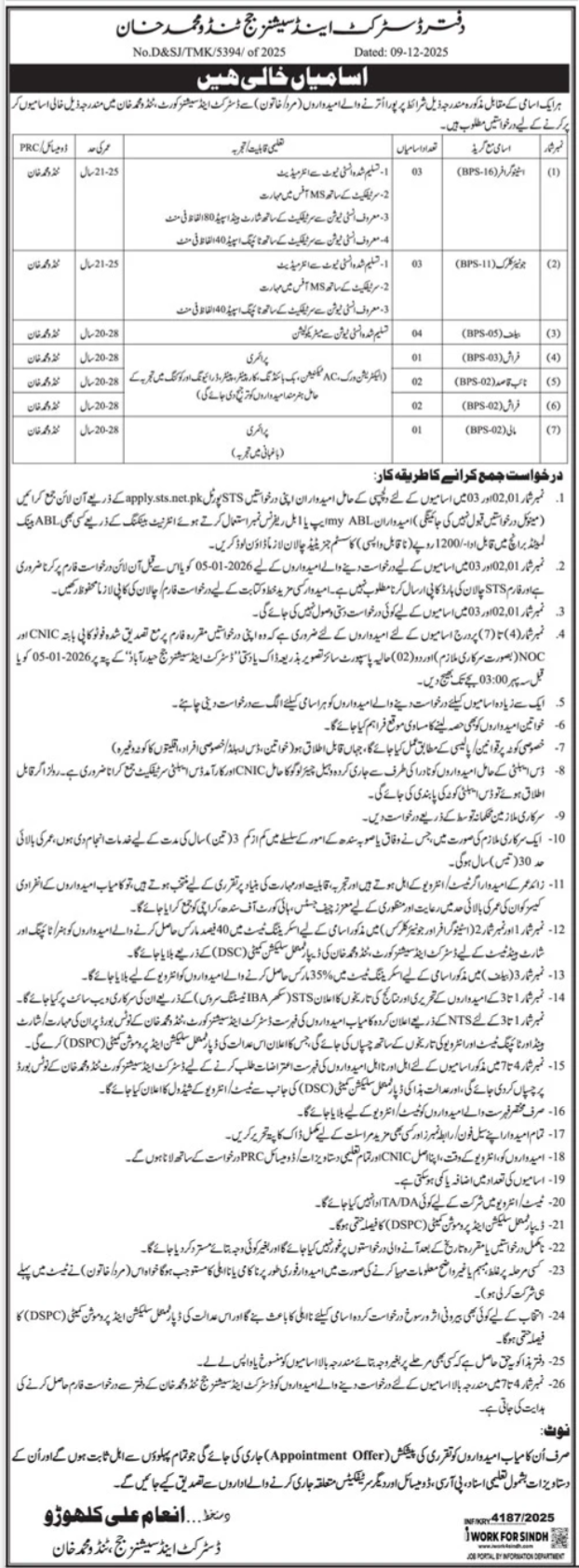 District & Session Judge Tando Muhammad Khan Jobs 2026 announce the Contract career opportunities for the post of See Below Ad in Sindh, Tando Muhammad Khan for the fresh and experienced candidates on Contract basis who have Check Advertisement degree. Posted date of this post is 13/12/2025 and the last date is 05/01/2026. if you are eligible for this job apply before due date.