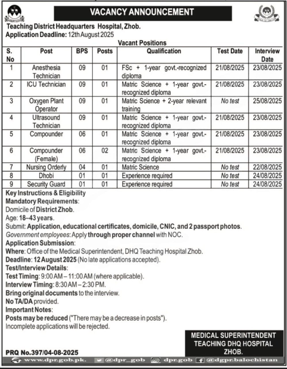 District Teaching Hospital Zhob Jobs 2025 announce the Contract career opportunities for the post of See Below Ad in Balochistan, Zhob for the fresh and experienced candidates on Contract basis who have Check Advertisement degree. Posted date of this post is 05/08/2025 and the last date is 12/08/2025. if you are eligible for this job apply before due date.