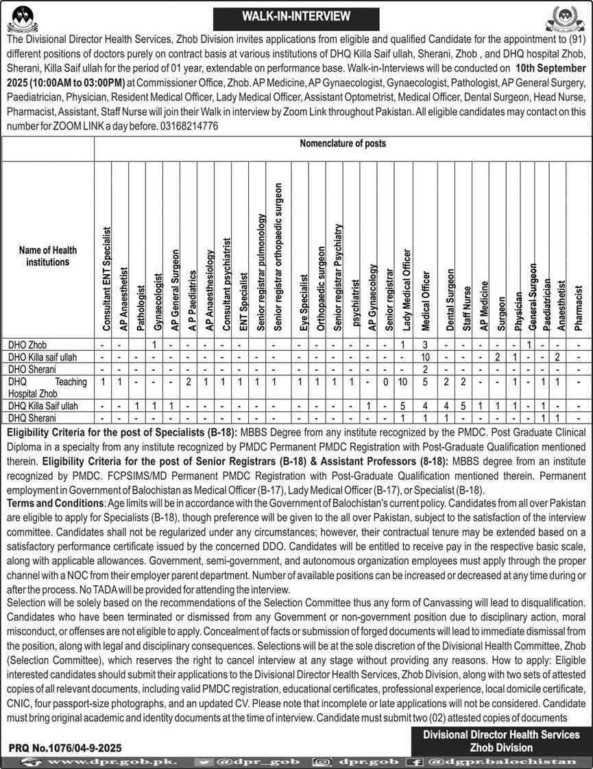 The Divisional Director Health Services, Zhob Division invites applications from eligible and qualified Candidate for the appointment to (91) different positions of doctors purely on contract basis at various institutions of DHQ Killa Saif ullah, Sherani, Zhob, and DHQ hospital Zhob, Sherani, Killa Saif ullah for the period of 01 year, extendable on performance base. Walk-in-Interviews will be conducted on 10th September 2025 (10:00AM to 03:00PM) at Commissioner Office, Zhob. AP Medicine, AP Gynaecologist, Gynaecologist, Pathologist, AP General Surgery, Paediatrician, Physician, Resident Medical Officer, Lady Medical Officer, Assistant Optometrist, Medical Officer, Dental Surgeon, Head Nurse, Pharmacist, Assistant, Staff Nurse will join their Walk in interview by Zoom Link throughout Pakistan. All eligible candidates may contact on this number for ZOOM LINK a day before. 03168214776