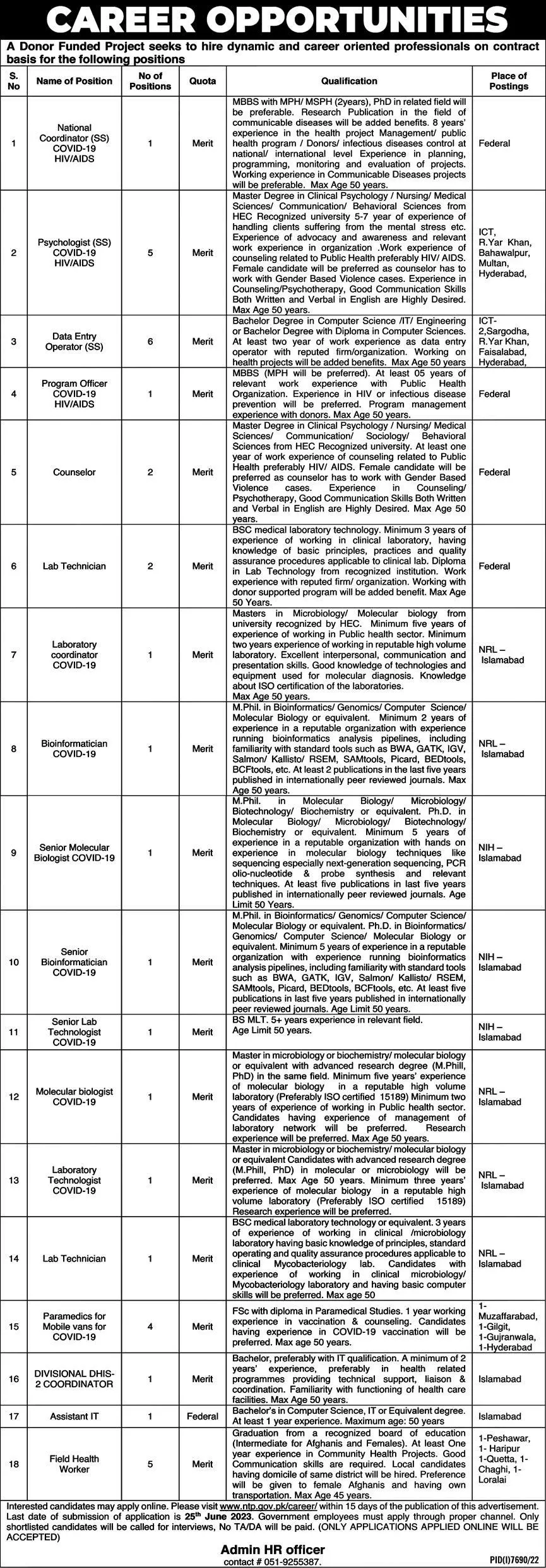 Donor Funded Project Islamabad Jobs 2023 announce the Contract career opportunities for the post of See Below Ad in Federal, Islamabad for the fresh and experienced candidates on Contract basis who have Check Advertisement degree. Posted date of this post is 11/06/2023 and the last date is 25/06/2023. if you are eligible for this job apply before due date.