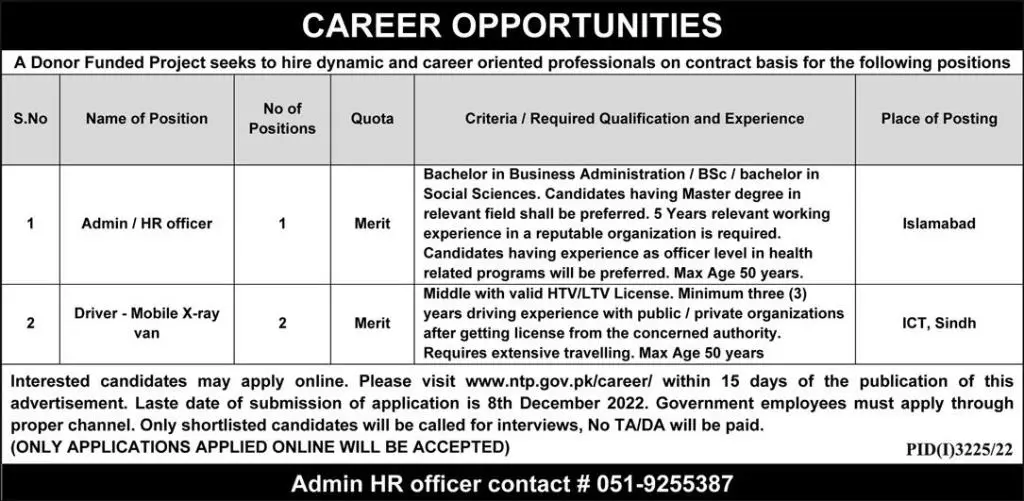 - Interested applicants may apply online for Admin / HR Officer and Driver through the website www.ntp.gov.pk. The candidate also sends their resumes for the post of Program Assistants, Drivers/Dispatch Riders, and Naib Qasid through email at programoffice.fb@gmail.com.