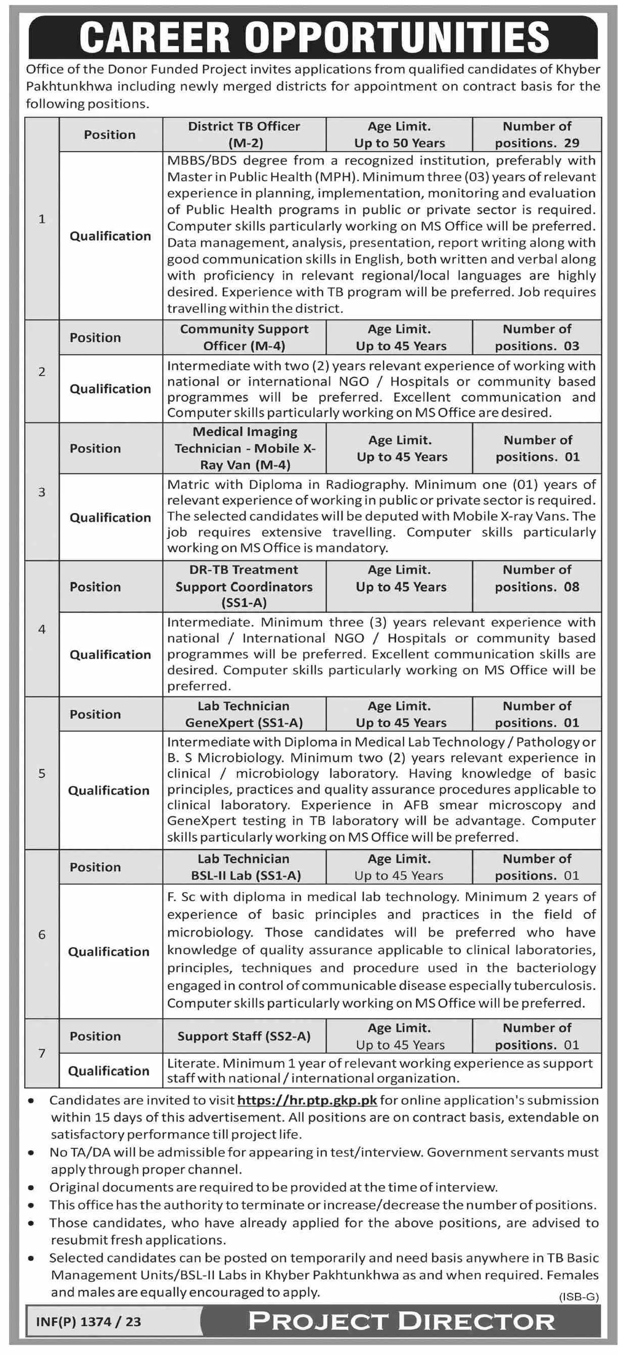 - Selected candidates can be posted on temporarily and need basis anywhere in TB Basic Management Units/BSL-II Labs in Khyber Pakhtunkhwa as and when required. Females and males are equally encouraged to apply. (ISB-G)