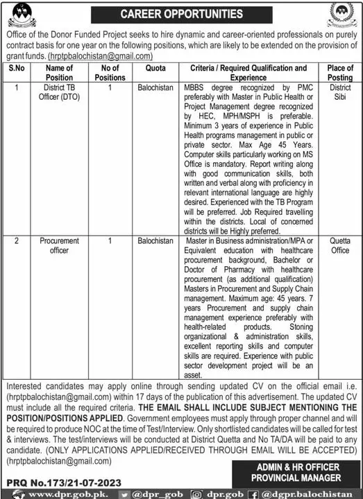 Donor funded Project Quetta Balochistan Jobs 2023 announce the Contract career opportunities for the post of See Below Ad in Balochistan, Quetta for the fresh and experienced candidates on Contract basis who have Check Advertisement degree. Posted date of this post is 22/07/2023 and the last date is 08/08/2023. if you are eligible for this job apply before due date.