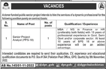 Donor Funded Public Sector Project Jobs 2022 announce the Contract career opportunities for the post of See Below Ad in Balochistan, Quetta for the fresh and experienced candidates on Contract basis who have Check Advertisement degree. Posted date of this post is 01/11/2022 and the last date is 08/11/2022. if you are eligible for this job apply before due date.