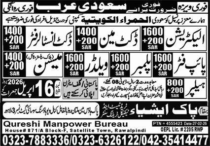Ducket Man And Plumber Jobs in Saudia Arabia 2026 announce the Contract career opportunities for the post of See Below Ad in Saudi Arabia for the fresh and experienced candidates on Contract basis who have Check Advertisement degree. Posted date of this post is 14/04/2026 and the last date is 16/04/2026. if you are eligible for this job apply before due date.