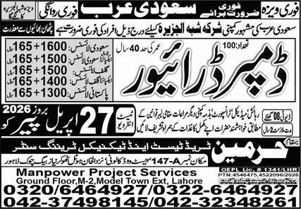 Dumper Driver Jobs in Saudia Arabia 2026 announce the Contract career opportunities for the post of See Below Ad in Saudi Arabia for the fresh and experienced candidates on Contract basis who have Check Advertisement degree. Posted date of this post is 26/04/2026 and the last date is 27/04/2026. if you are eligible for this job apply before due date.