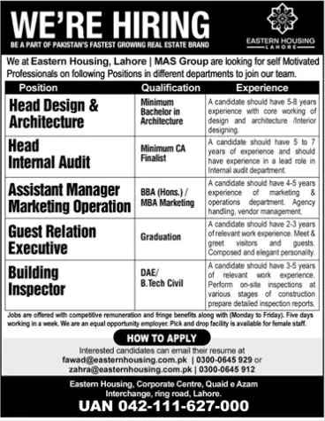 - Eastern Housing Lahore is looking for candidates for following posts as per job advertisement published in daily Jang Newspaper of May 21, 2023 for location Lahore, lahore Punjab Pakistan:guest relation executive,head internal audit,building inspector,head design architecture and assistant manager marketing operation