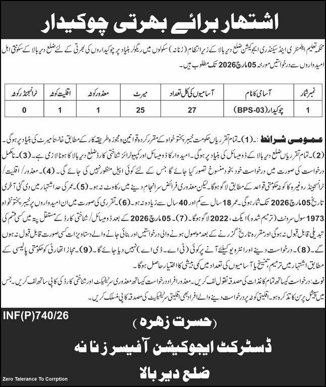 Education Department Upper Dir Jobs 2026 For Chowkidar announce the Contract career opportunities for the post of See Below Ad in Khyber Pakhtunkhwa, Upper Dir for the fresh and experienced candidates on Contract basis who have Check Advertisement degree. Posted date of this post is 19/02/2026 and the last date is 05/03/2026. if you are eligible for this job apply before due date.