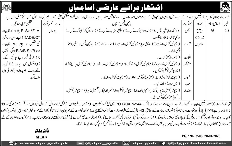 Education Project balochistan Tutor Jobs 2023 announce the Contract career opportunities for the post of See Below Ad in Balochistan, Chaman for the fresh and experienced candidates on Contract basis who have Check Advertisement degree. Posted date of this post is 21/04/2023 and the last date is 05/05/2023. if you are eligible for this job apply before due date.