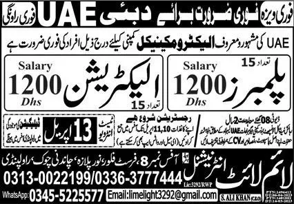 Electrician and Plumber Jobs in Dubai 2023 announce the Contract career opportunities for the post of See Below Ad in Dubai for the fresh and experienced candidates on Contract basis who have Check Advertisement degree. Posted date of this post is 08/04/2023 and the last date is 13/04/2023. if you are eligible for this job apply before due date.