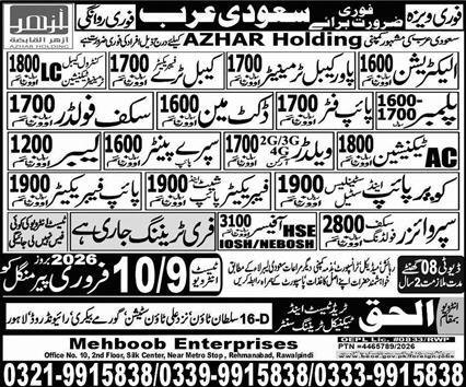 Electrician And Supervisor Jobs In Saudi Arabia 2026 announce the Contract career opportunities for the post of See Below Ad in Saudi Arabia for the fresh and experienced candidates on Contract basis who have Check Advertisement degree. Posted date of this post is 08/02/2026 and the last date is 10/02/2026. if you are eligible for this job apply before due date.