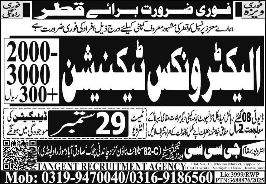 Electronics Technician Jobs 2025 In Qatar announce the Contract career opportunities for the post of See Below Ad in Qatar for the fresh and experienced candidates on Contract basis who have Check Advertisement degree. Posted date of this post is 27/09/2025 and the last date is 29/09/2025. if you are eligible for this job apply before due date.