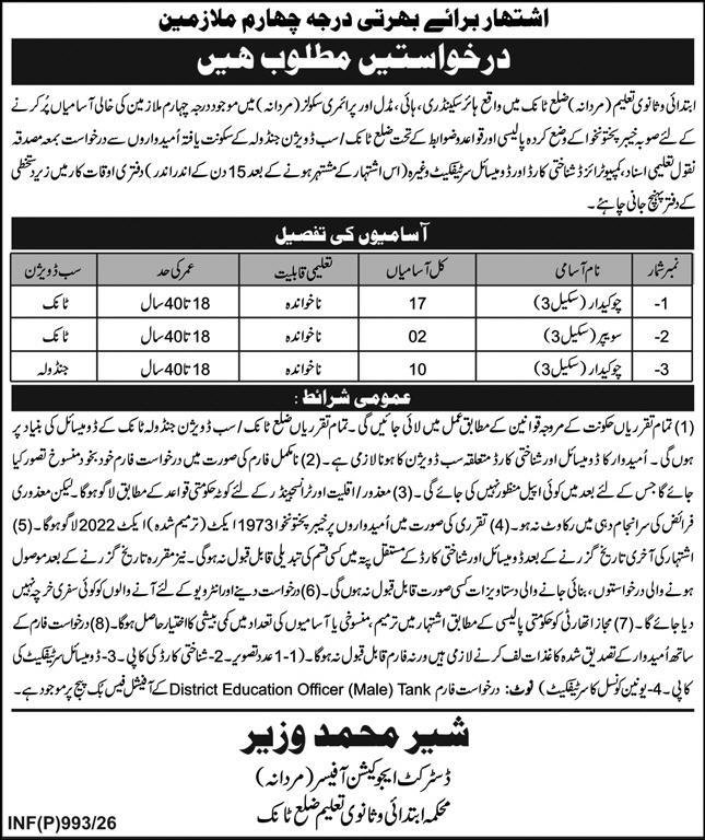 Elementary & Secondary Education Department Tank Jobs 2026 announce the Contract career opportunities for the post of See Below Ad in Khyber Pakhtunkhwa, Tank for the fresh and experienced candidates on Contract basis who have Check Advertisement degree. Posted date of this post is 07/03/2026 and the last date is 25/03/2026. if you are eligible for this job apply before due date.